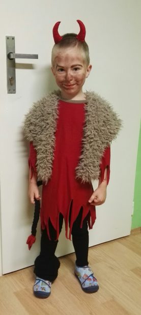 Všechny děti v jeho třídě a dokonce i obě paní učitelky byly taky v čertovském. Ostatní dvě třídy měly jiné kostýmy, jedna představovala nebe a druhá zimu, takže jsem viděl taky dost andělů, princezny Elsy a sněhuláky Olafy. Ve školce prý chodil Mikuláš a děti od něj dostaly malý balíček s nadílkou.