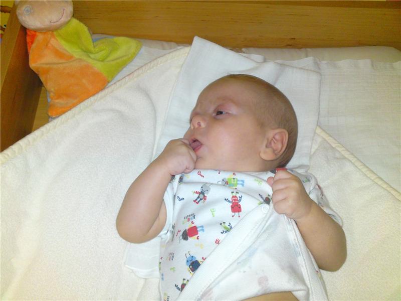 V posledním týdnu ale pláč při této činnosti ustával a někdy se dokonce i smál nebo si jen tak cucal palečky, protože se už nemohl dočkat mlíčka. Stejné je to i s uspáváním. Když se krásně napije a odříhne si, tak je potom schopný do minuty usnout a ani nepostřehne, že jej pokládám do postýlky. Někdy ještě není hned unavený, ale vydrží sám ležet na zádech a potom začne trochu fňukat, tak jej pohoupu nebo pochovám a rychle usíná. Doufám, že to teď všechno nezakřiknu.