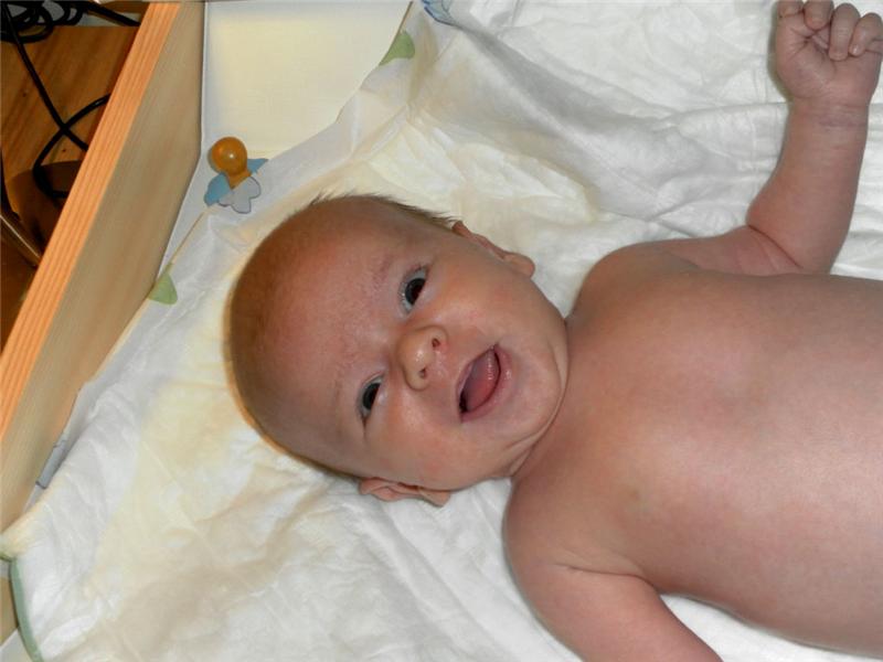Taky se už umí krásně smát. Když má dobrou náladu, směje se, brouká si, usmívá se i se směje nahlas nebo to alespoň zkouší. Jednou se už usmál i na mě, jestli to nebyla náhoda – usmála jsem se na něj a on se usmál na oplátku. Paní doktorka ho chválila, že je aktivní a zvídavý – po všem zvědavě kouká a otáčí se za hlasy, vypadá to, že poslouchá.