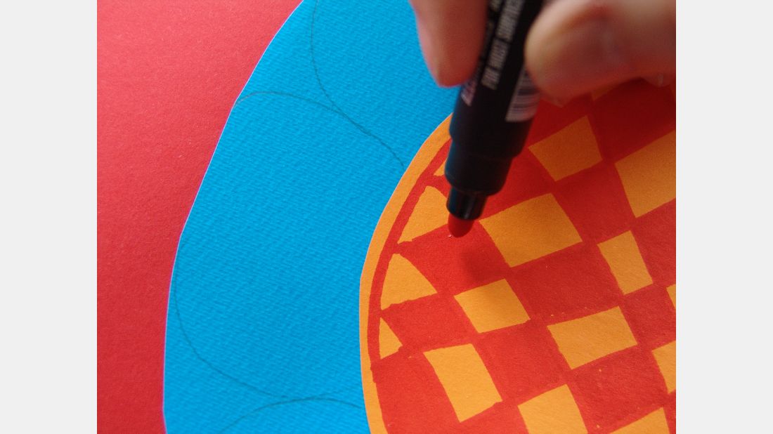 Střed květiny vybarvíme fixy, volíme jednoduché dekorativní prvky, jako jsou kolečka, čárky, puntíky nebo vybarvenou šachovnici, jimiž ozdobíte jednobarevnou plochu.  Střed vlepte doprostřed květu. Zdroj: Hana Rašínová