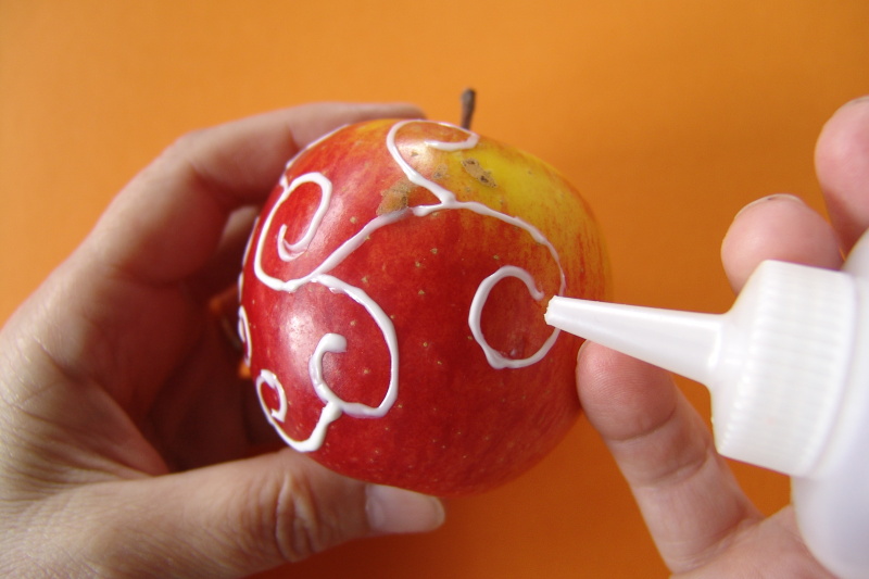 V misce si umícháme polevu z moučkového cukru a lžíce čisté citronové šťávy. Poleva musí být velmi důkladně rozmíchaná, aby v ní nezůstaly sebemenší hrudky cukru, které by nás pak zlobily při zdobení jablíček. Je to vlastně stejná poleva i metoda, jakou používáme při zdobení vánočních perníčků.