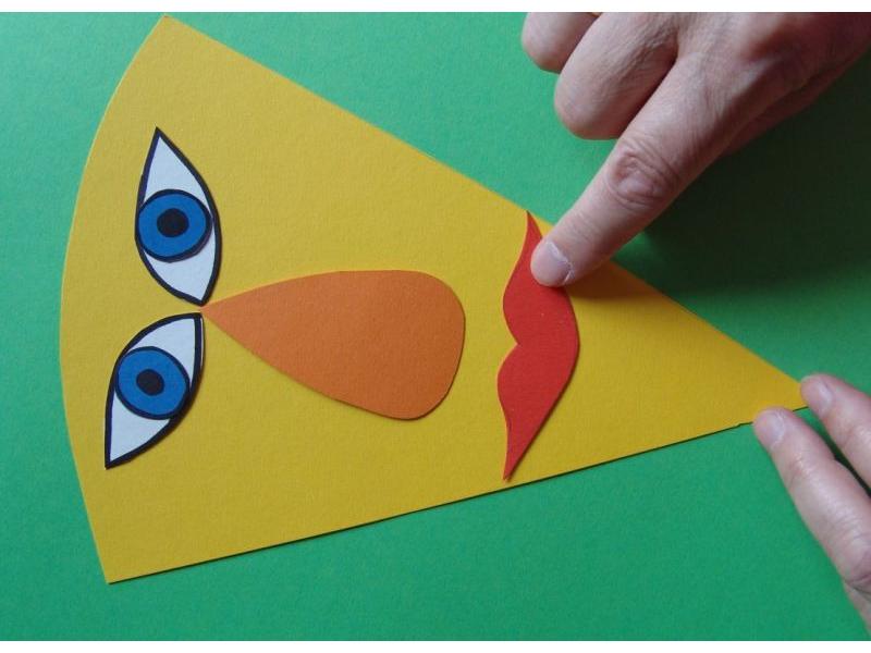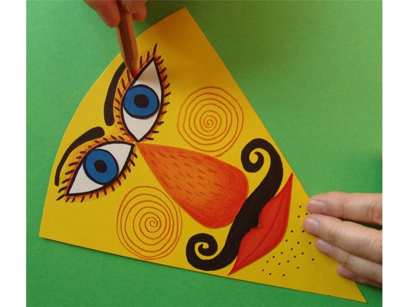 Nejdříve si z pevného barevného kartonu formátu A4 vystřihneme větší trojúhelníkovitý tvar hlavy. Volíme takovou barvu, na kterou můžeme kreslit pastelkami a fixy a kresba bude dostatečně výrazná. My jsme si zvolili příjemnou oranžovou a žlutou. Z různobarevných zbytků papírů pak vystřihneme jednotlivé části obličeje, které si můžeme předkreslit tužkou, abychom zvolili ty správné proporce.