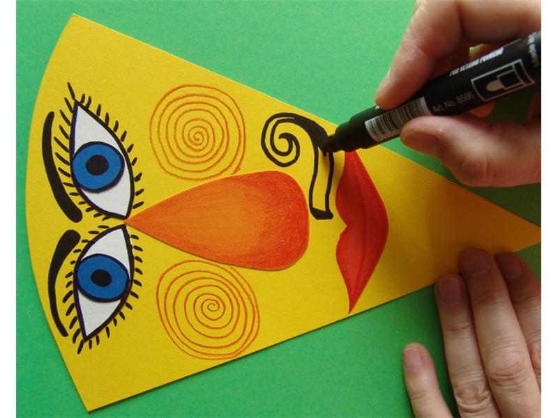 Když je obličej hotový a jednotlivé jeho části nalepené, můžeme ho ještě dokreslit pastelkami nebo fixy. I tady se snažíme o maximální pestrost a náš drak může být veselý, zamračený, nazlobený – to všechno se dá kresbou vyjádřit. Kdo se však na kresbu zrovna moc necítí, může vytvořit celé hlavičky z odstřižků barevných papírů.